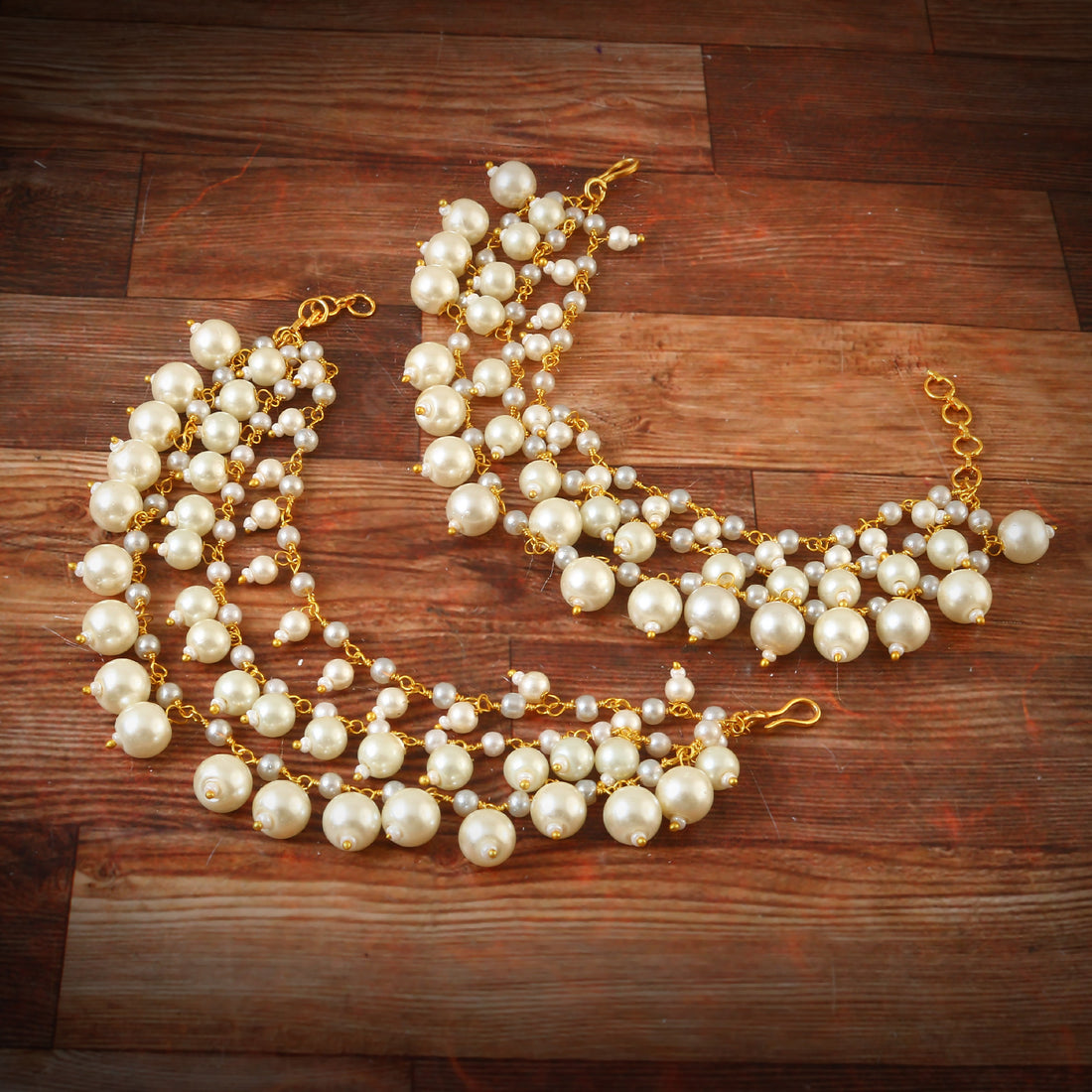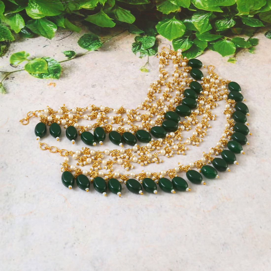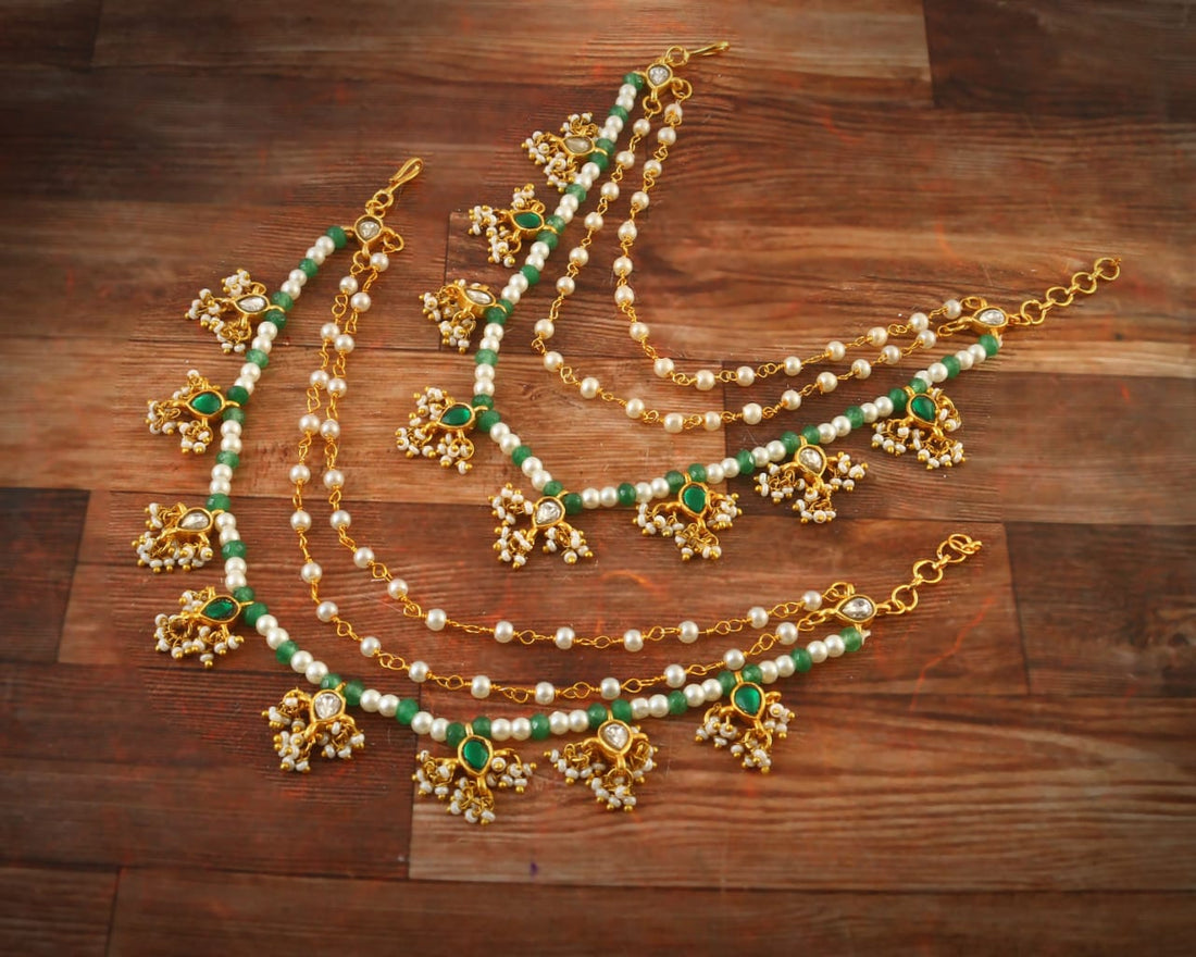 These handcrafted jadau kundan Maatal feature a harmonious blend of red, green, and white hues,...