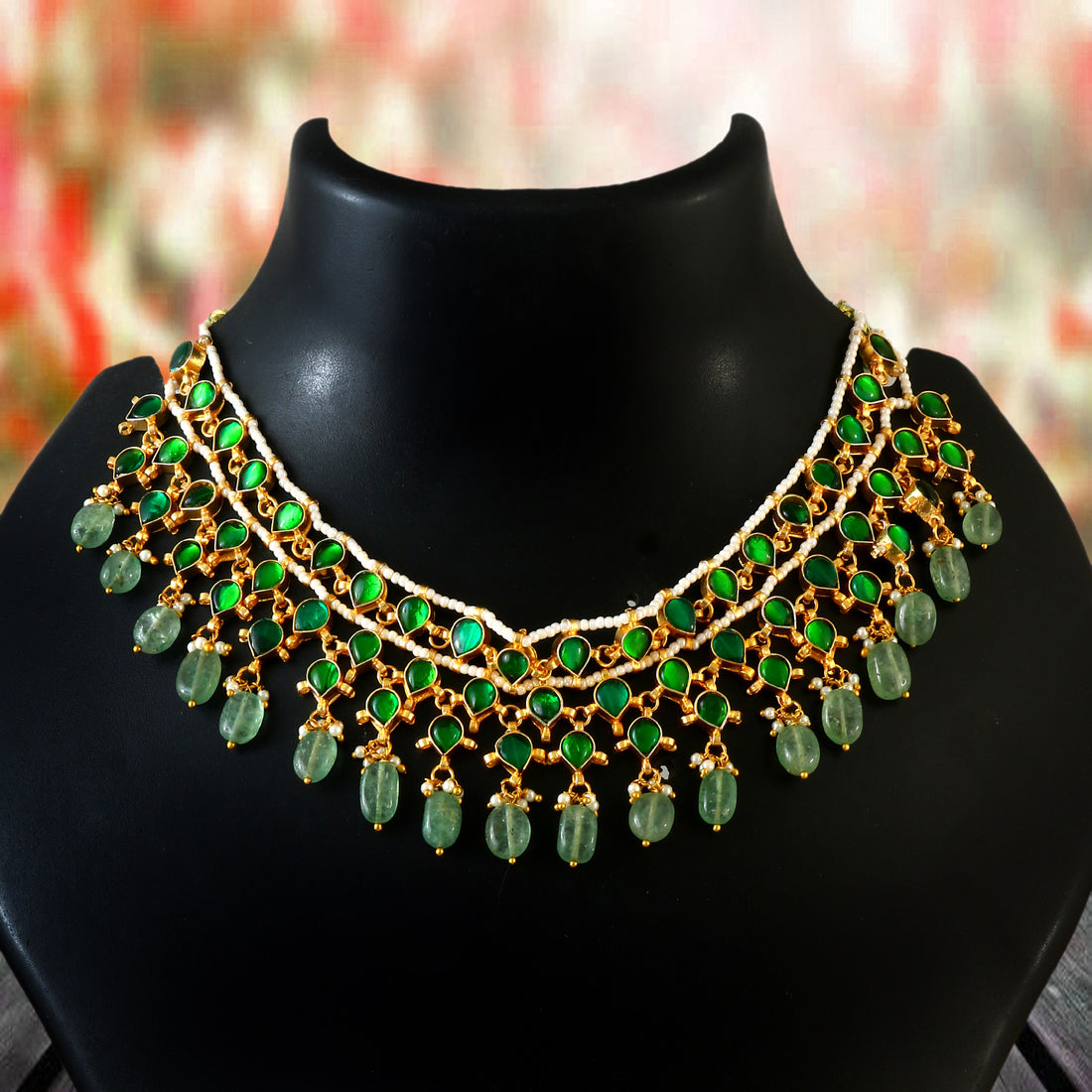 This Jadau Kundan necklace artfully combines peacock and floral motifs, reflecting exquisite craftsmanship and timeless...