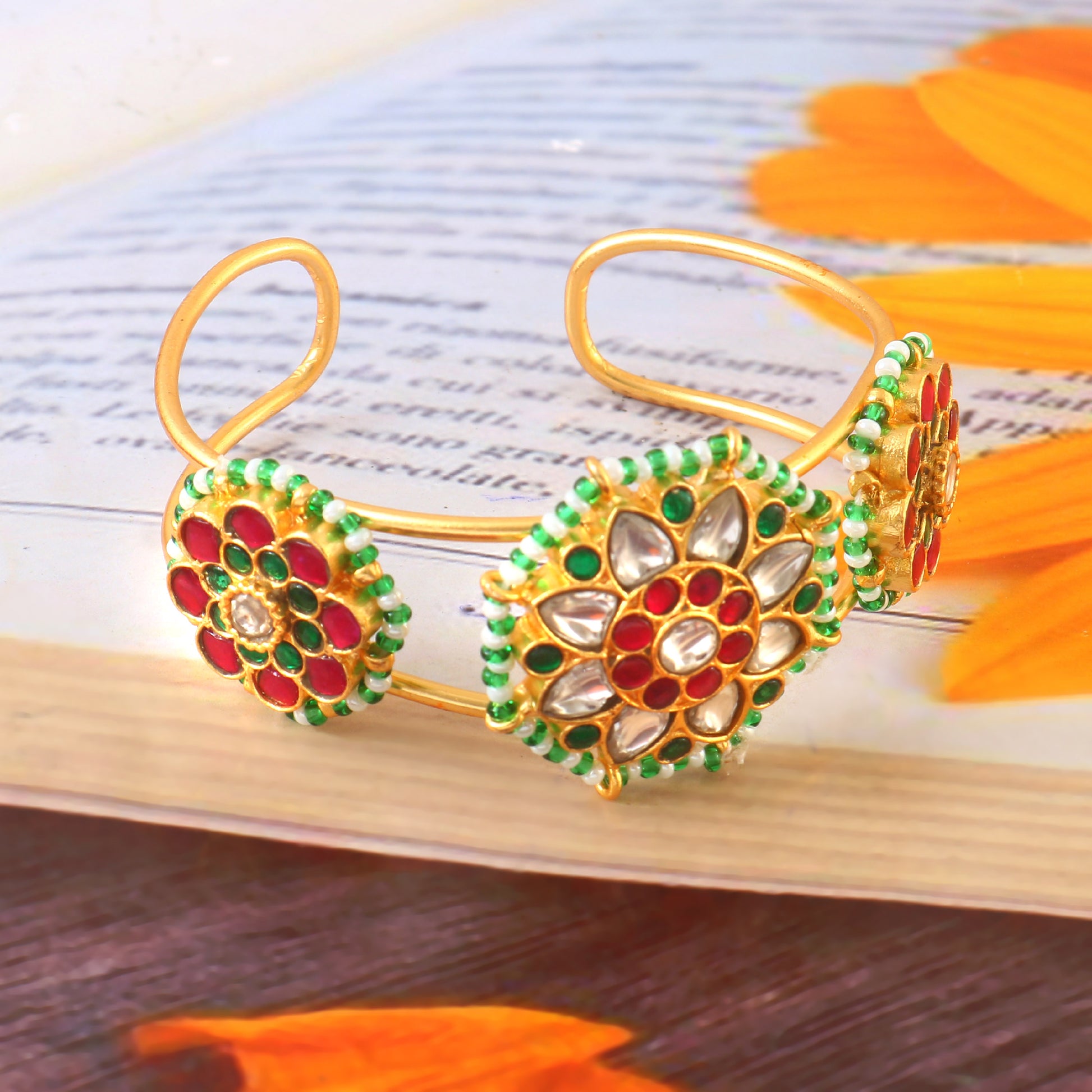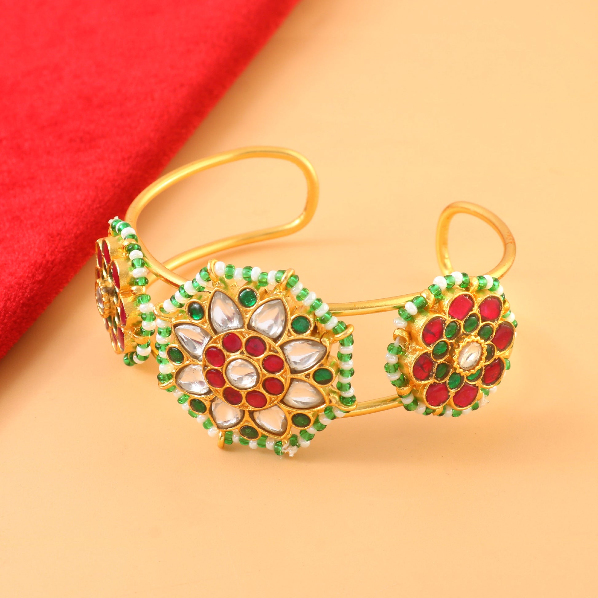 These handcrafted jadau kundan Bangle feature a harmonious blend of red, green, and white hues, showcasing intricate artistry and unique design. Each piece reflects meticulous craftsmanship, making them a distinguished accessory that adds elegance and cultural richness to your collection.