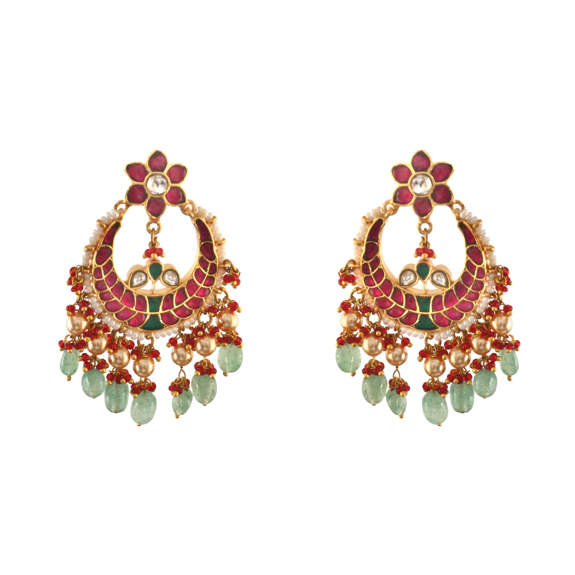 These Jadau Kundan earrings in classic jhumka style showcase intricate craftsmanship and traditional elegance. Expertly handcrafted, they feature detailed gemstone settings that add a timeless charm, making them an ideal accessory for festive and bridal occasions.
