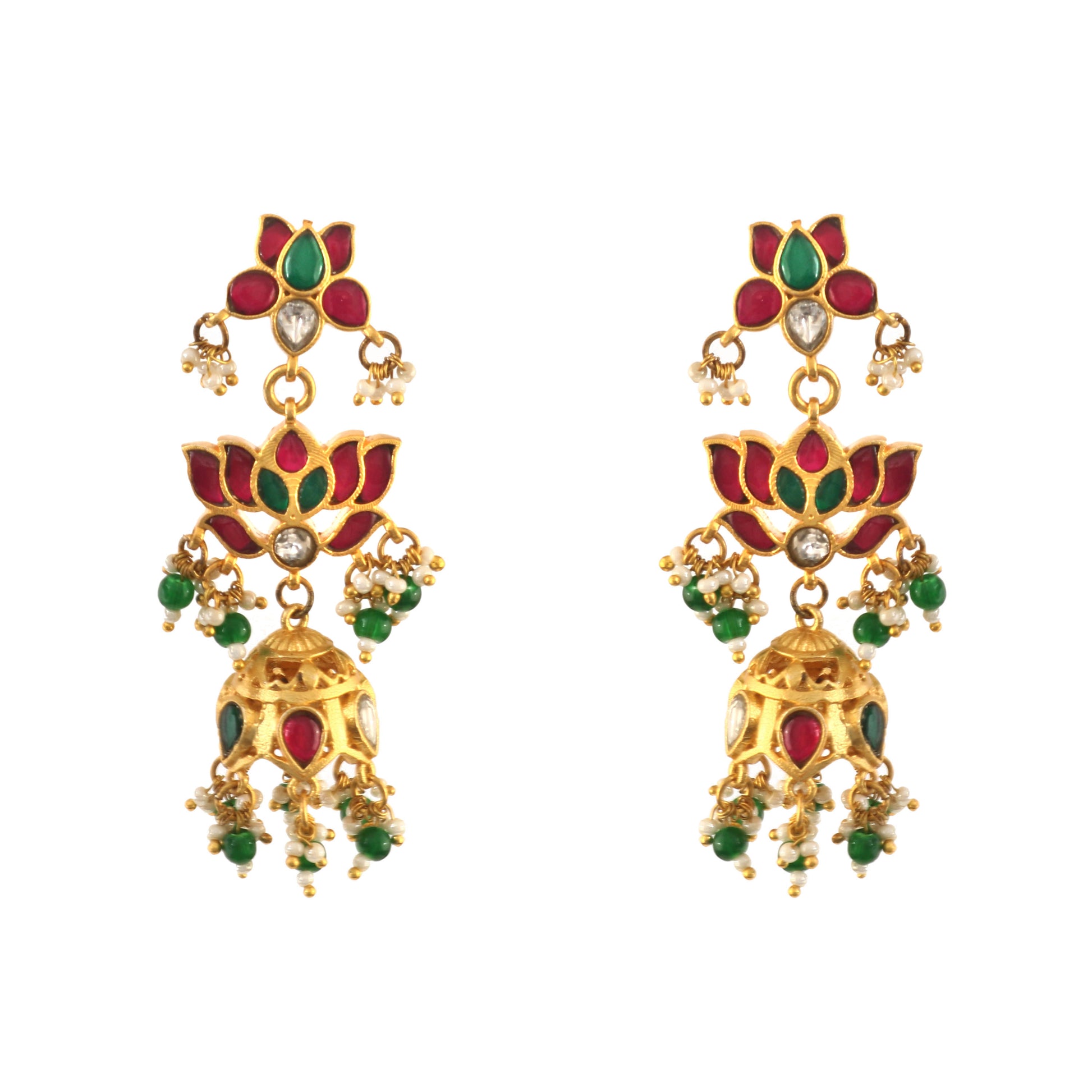 These Jadau Kundan jhumka earrings exemplify handcrafted Indian artistry, featuring intricate detailing and traditional gemstone settings. Meticulously made by skilled artisans, they bring a rich cultural heritage to your ensemble, perfect for elevating festive and bridal looks with timeless elegance.
