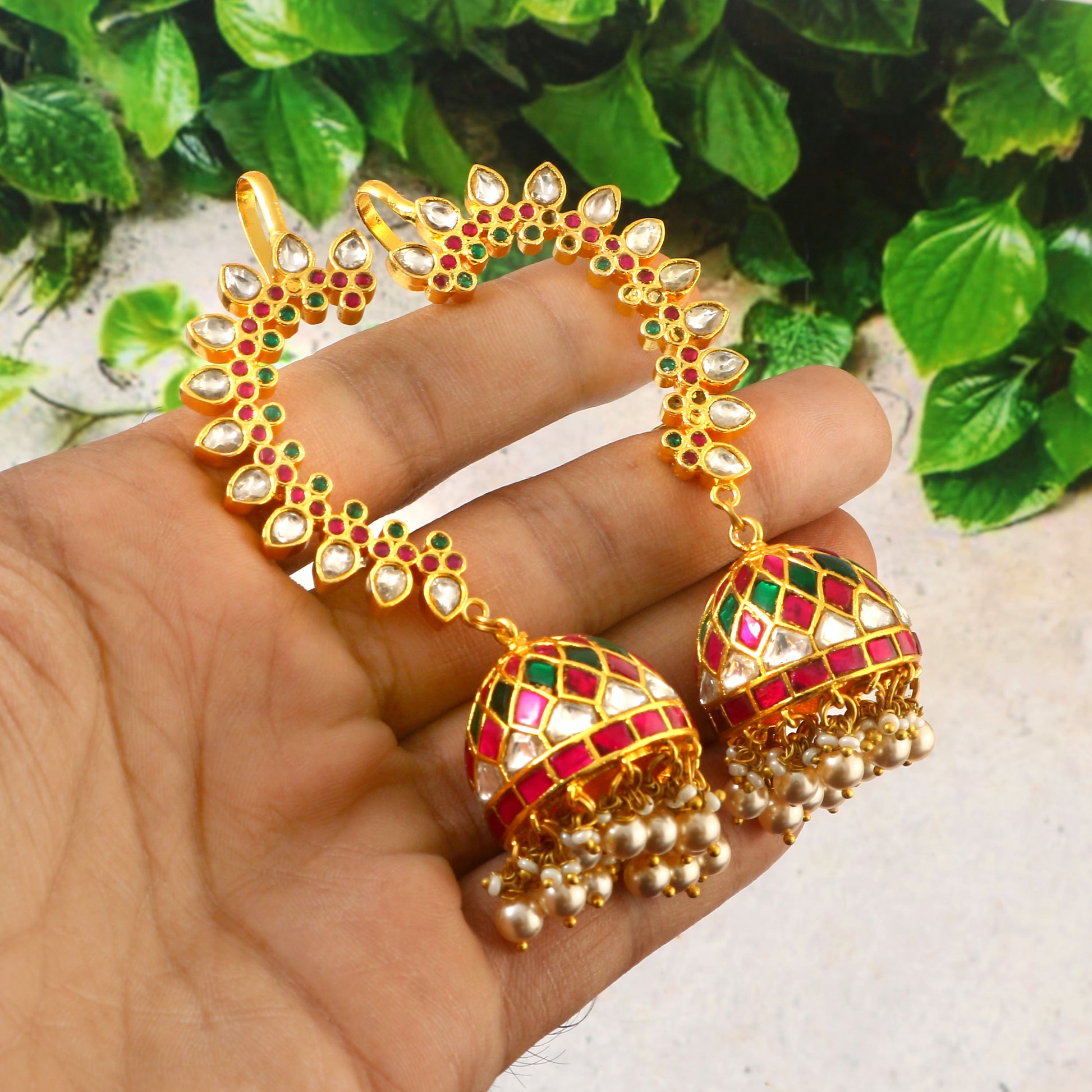 These handcrafted jadau kundan jhumka earrings feature a harmonious blend of red, green, and white hues, showcasing intricate artistry and unique design. Each piece reflects meticulous craftsmanship, making them a distinguished accessory that adds elegance and cultural richness to your collection.