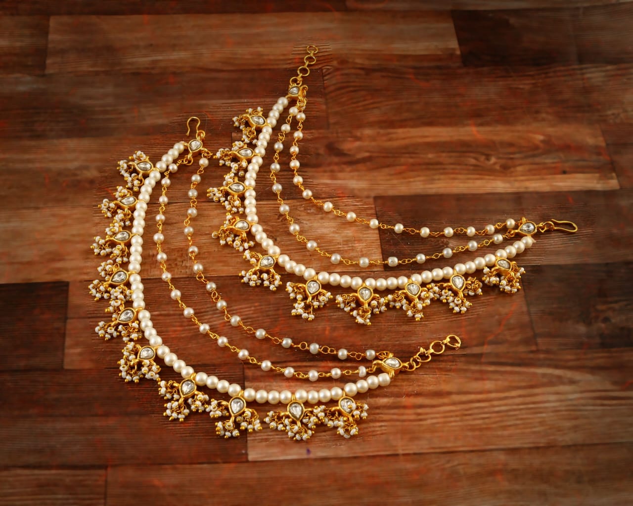 These handcrafted jadau kundan Maatal feature a harmonious blend of red, green, and white hues, showcasing intricate artistry and unique design. Each piece reflects meticulous craftsmanship, making them a distinguished accessory that adds elegance and cultural richness to your collection.