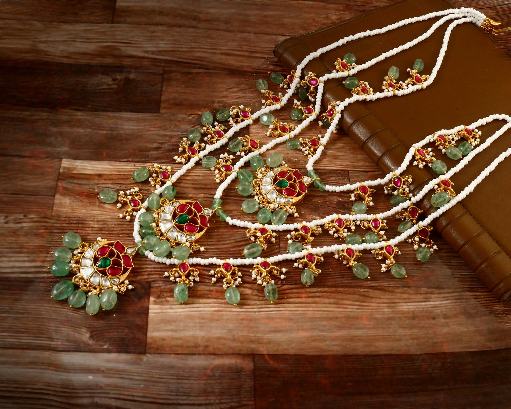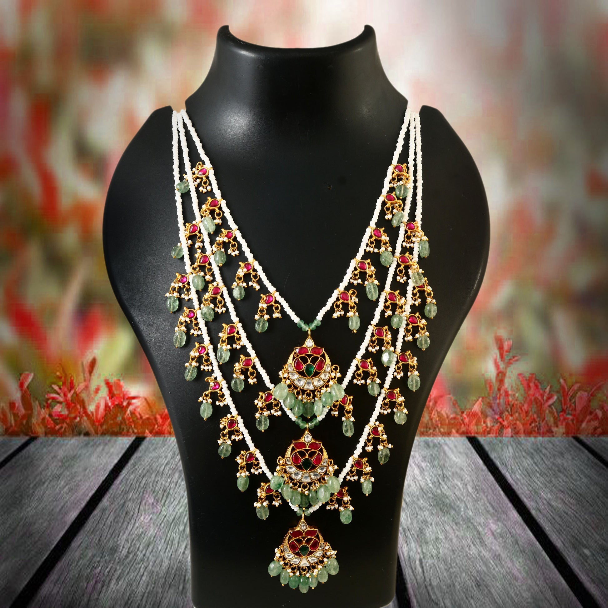 This three-layer Jadau Kundan necklace showcases intricate craftsmanship with multiple tiers of expertly set kundan stones. Its layered design adds depth and grandeur, making it a striking centerpiece for traditional occasions. Combining elegance and cultural heritage, it elevates any ensemble with refined sophistication.