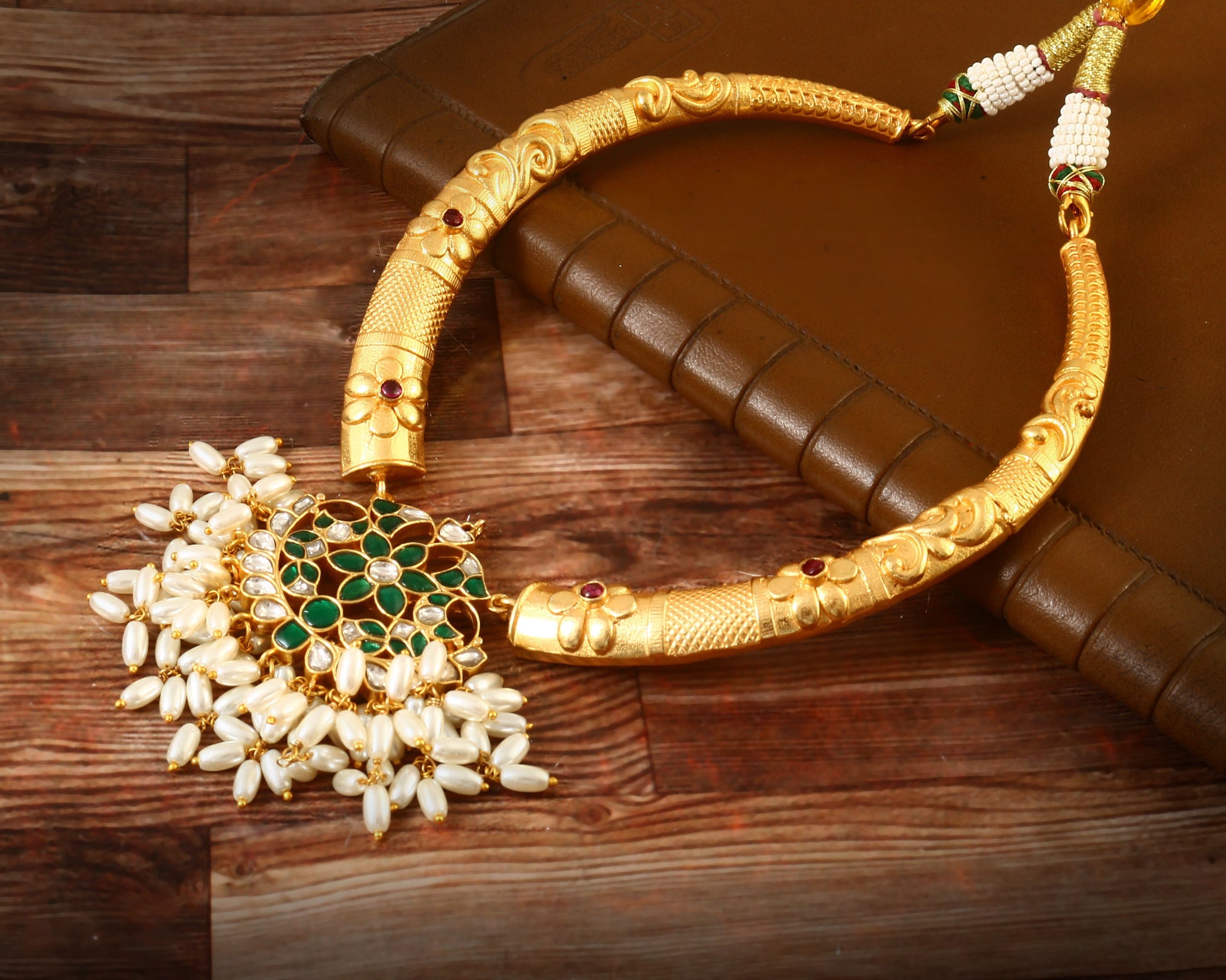 This Jadau Kundan necklace exudes a regal aura with its intricate craftsmanship and lavish kundan stone settings. Designed to evoke royal elegance, it enhances traditional attire with a majestic presence, making it an exquisite choice for grand celebrations and formal occasions.