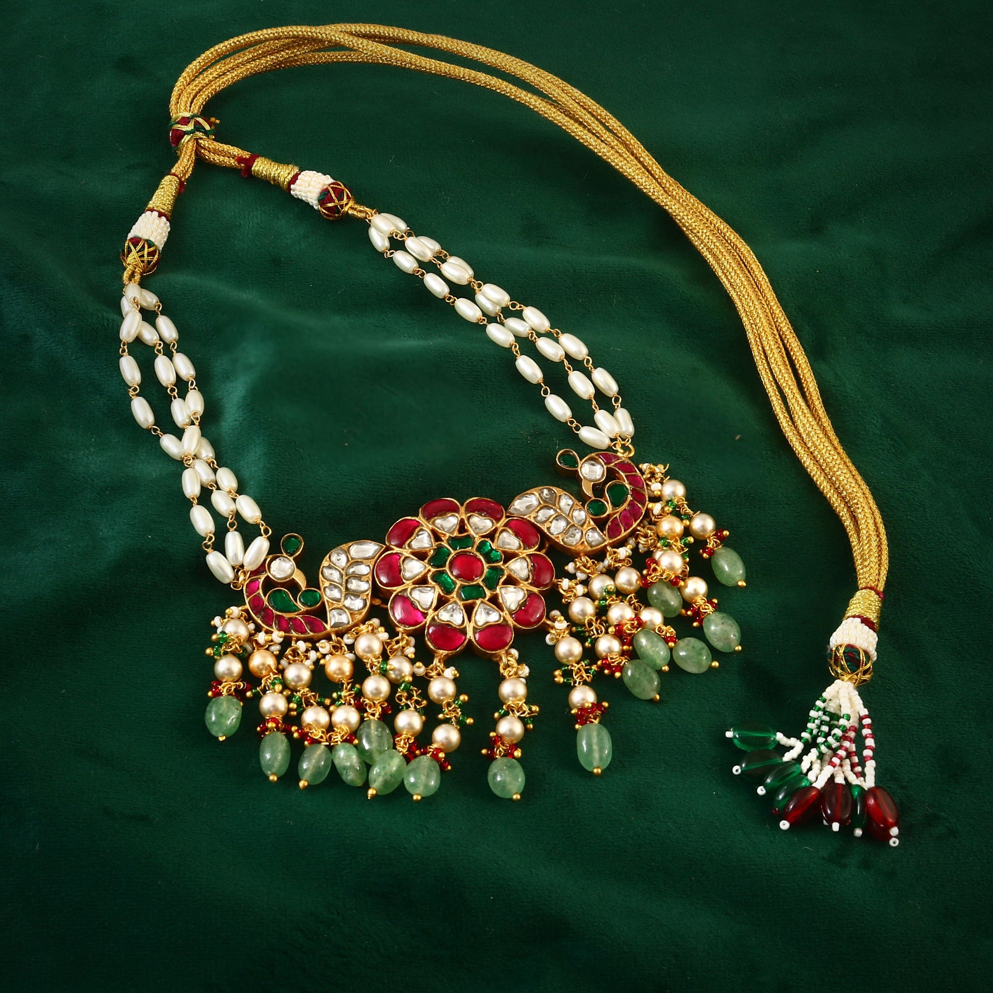 The Jadau Kundan Chokar necklace is a masterpiece of traditional Indian jewellery, renowned for its intricate craftsmanship and regal design. This style features a close-fitting collar adorned with meticulously set uncut diamonds and precious stones embedded in pure gold using the ancient Jadau technique. Necklace 24 exemplifies this exquisite artistry, combining rich cultural heritage with sophisticated elegance. Ideal for special occasions, the chokar enhances the neckline with its detailed patterns and timeless charm, reflecting the expert skill and legacy of Jadau Kundan craftsmanship.