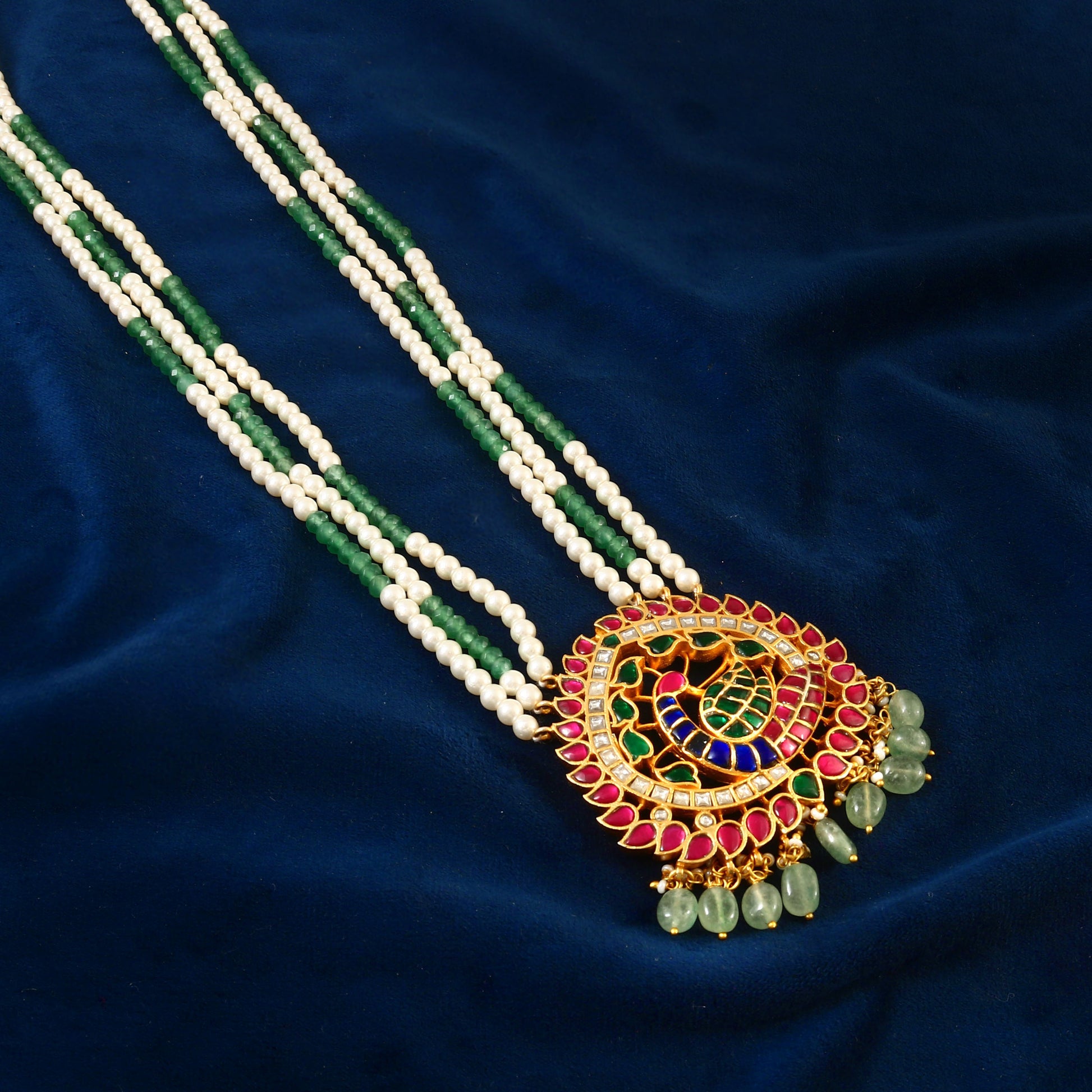 This jadau kundan long necklace exudes a regal aura with its intricate craftsmanship and elegant design. Featuring expertly set kundan stones, it offers a majestic look that complements traditional attire, making it an ideal choice for grand celebrations and royal-inspired ensembles.