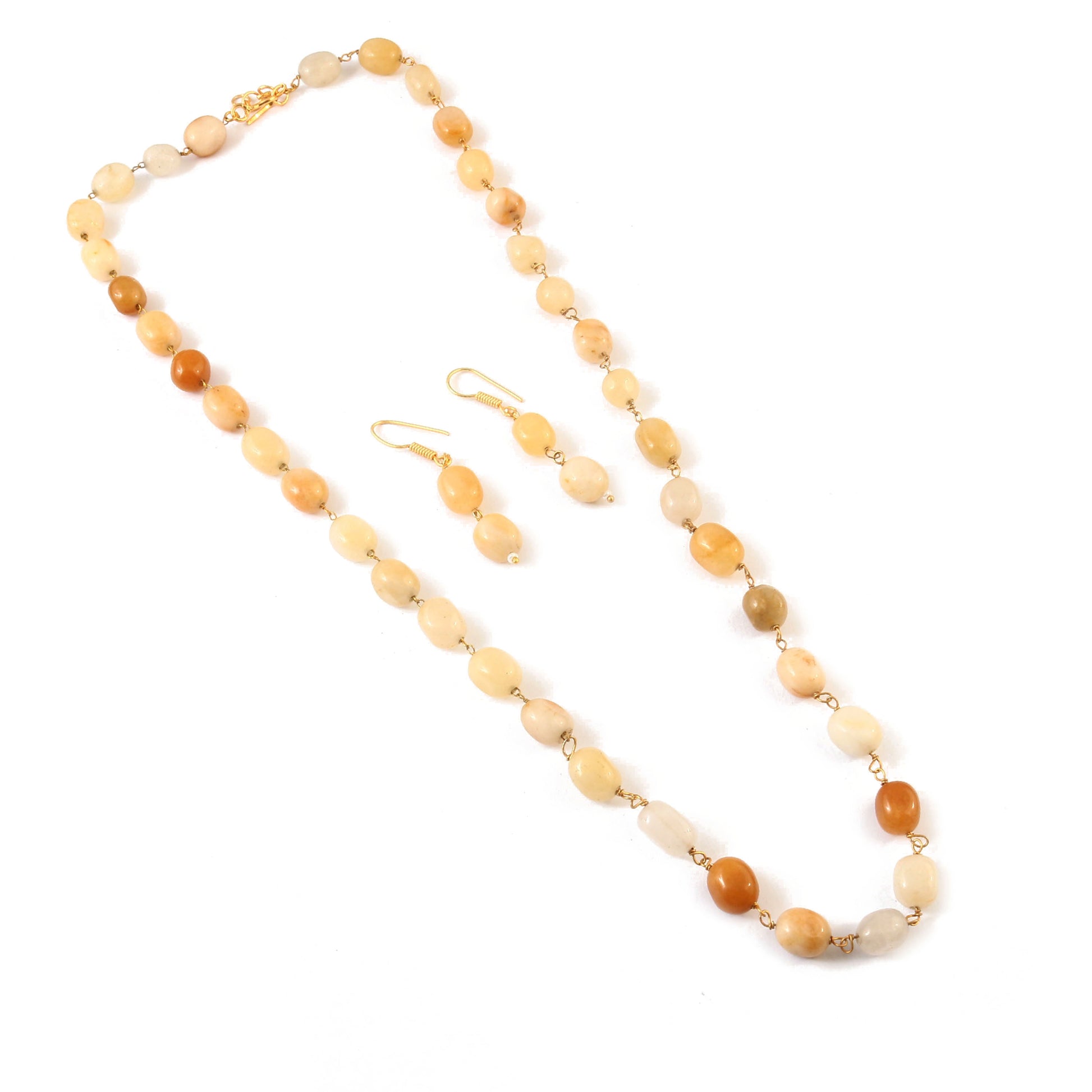 This exquisite necklace features a delicate mala crafted from multi-shade motis in off-white, skin, and vibrant orange hues, creating a harmonious blend of subtlety and warmth. Paired with matching earrings, this set offers a refined elegance perfect for enhancing both traditional and contemporary outfits. The carefully selected colors and craftsmanship ensure a versatile accessory that complements various skin tones and occasions.