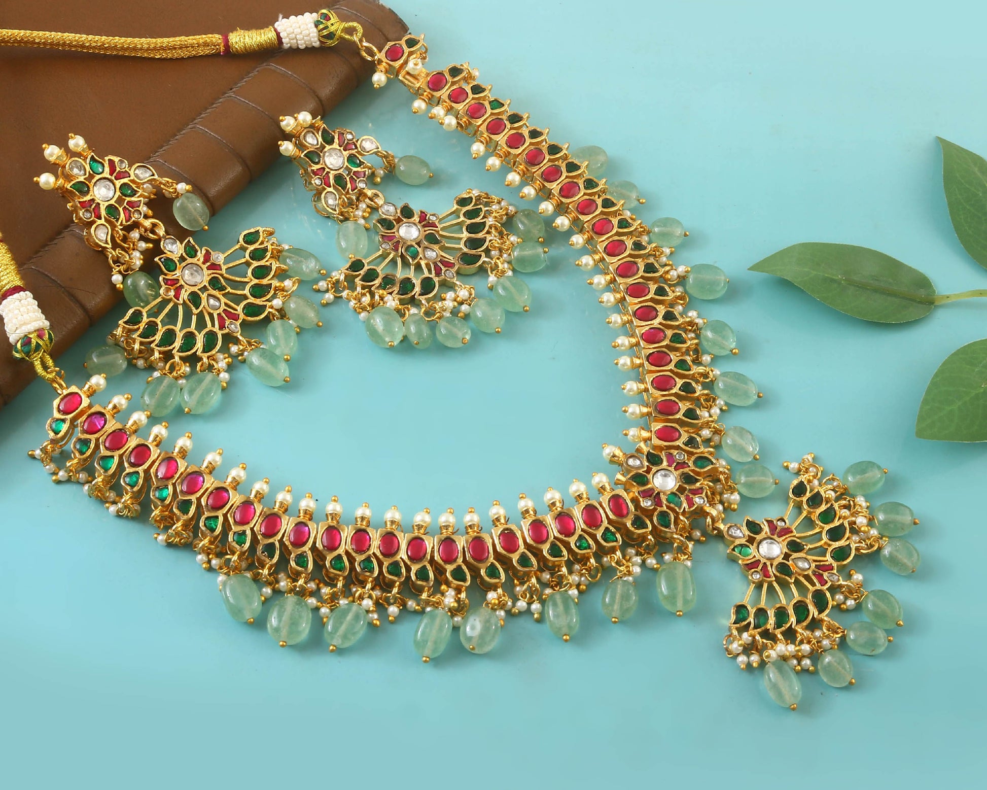 This Jadau Kundan necklace artfully combines peacock and floral motifs, reflecting exquisite craftsmanship and timeless elegance. The intricate design highlights traditional artistry, making it a refined statement piece that enhances any ethnic ensemble with grace and sophistication.
