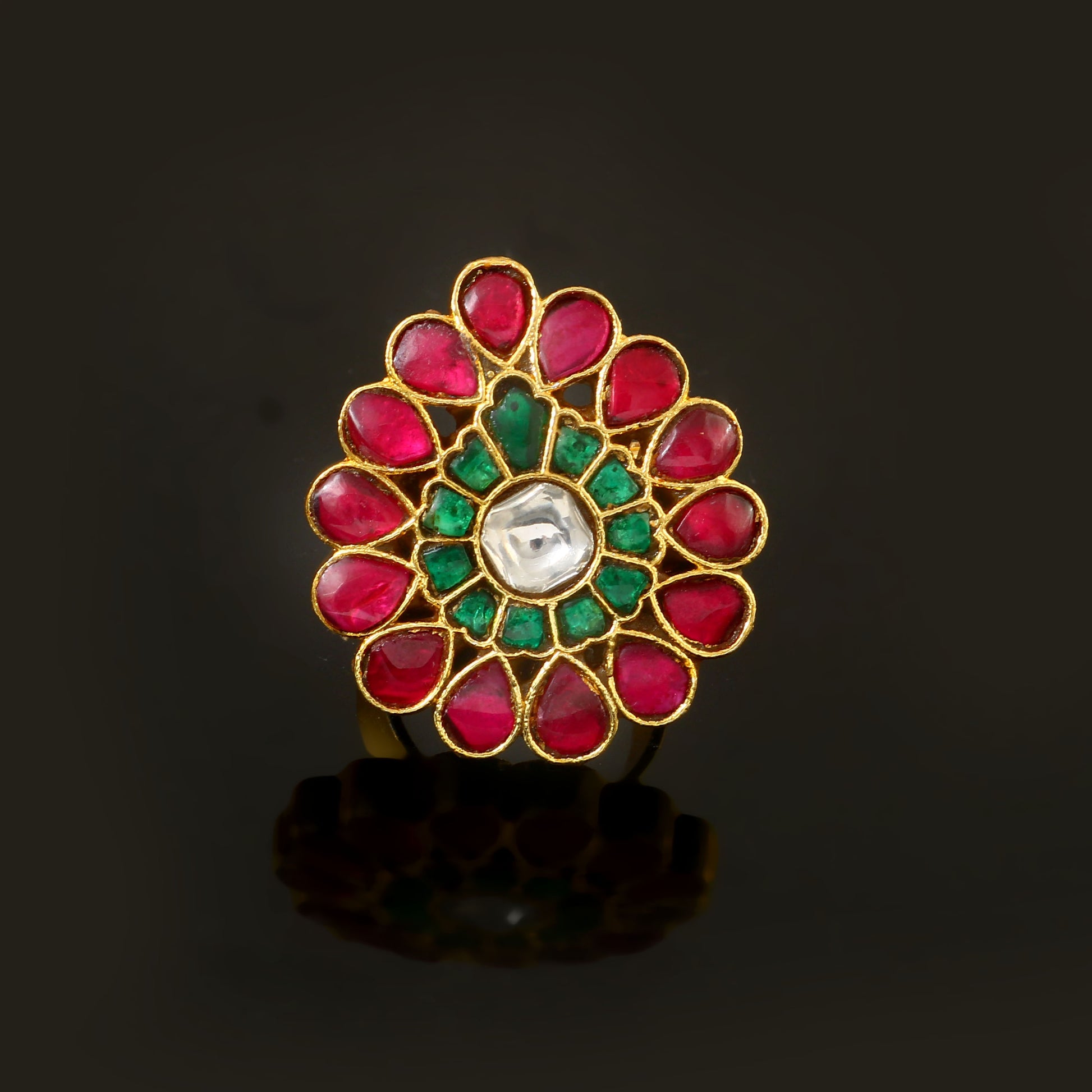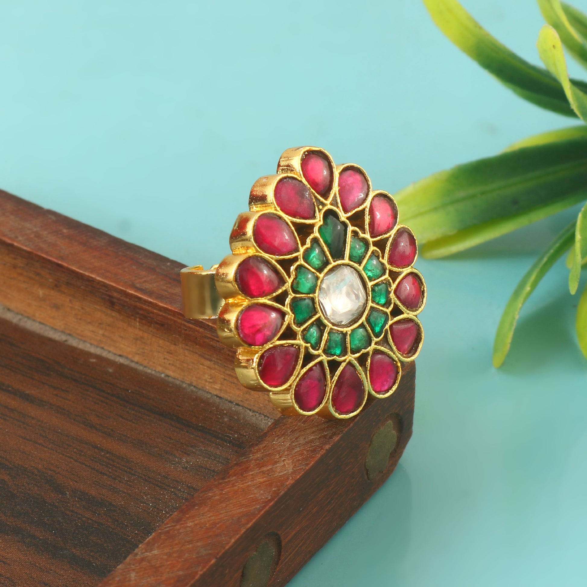 These handcrafted jadau kundan Ring feature a harmonious blend of red, green, and white hues, showcasing intricate artistry and unique design. Each piece reflects meticulous craftsmanship, making them a distinguished accessory that adds elegance and cultural richness to your collection.
