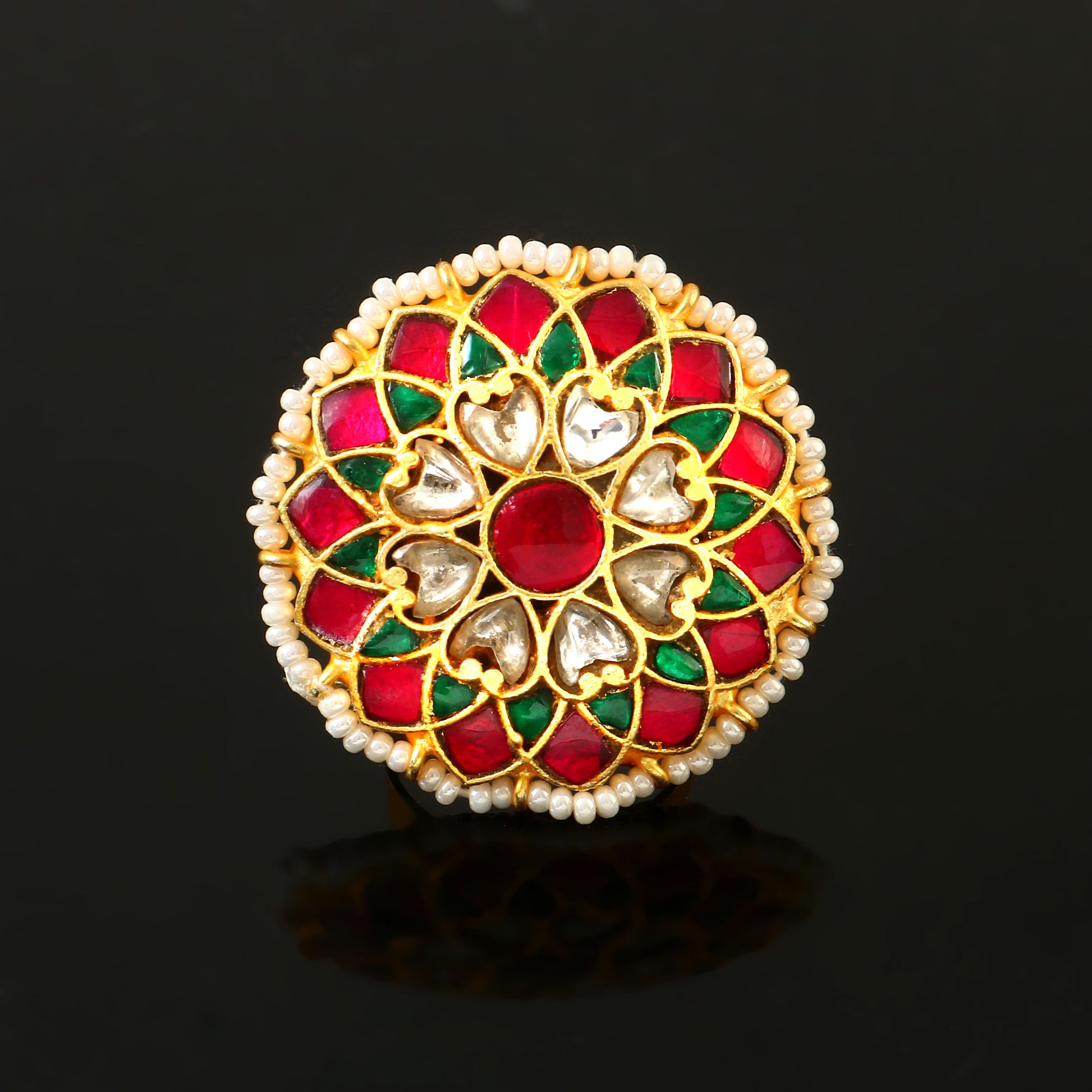 These handcrafted jadau kundan Ring feature a harmonious blend of red, green, and white hues, showcasing intricate artistry and unique design. Each piece reflects meticulous craftsmanship, making them a distinguished accessory that adds elegance and cultural richness to your collection.