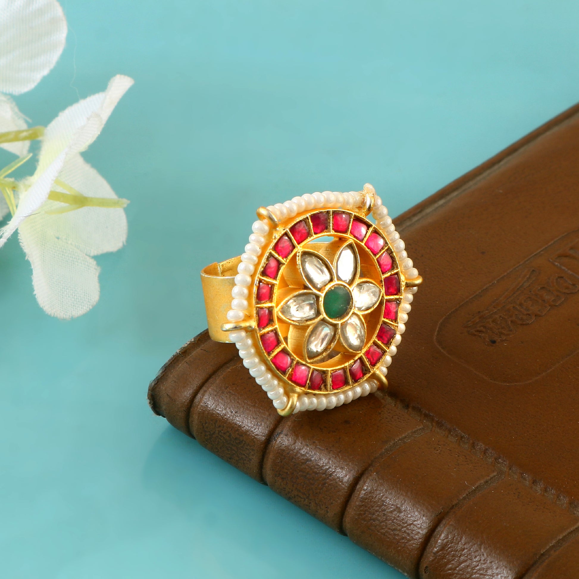 These handcrafted jadau kundan Ring feature a harmonious blend of red, green, and white hues, showcasing intricate artistry and unique design. Each piece reflects meticulous craftsmanship, making them a distinguished accessory that adds elegance and cultural richness to your collection.