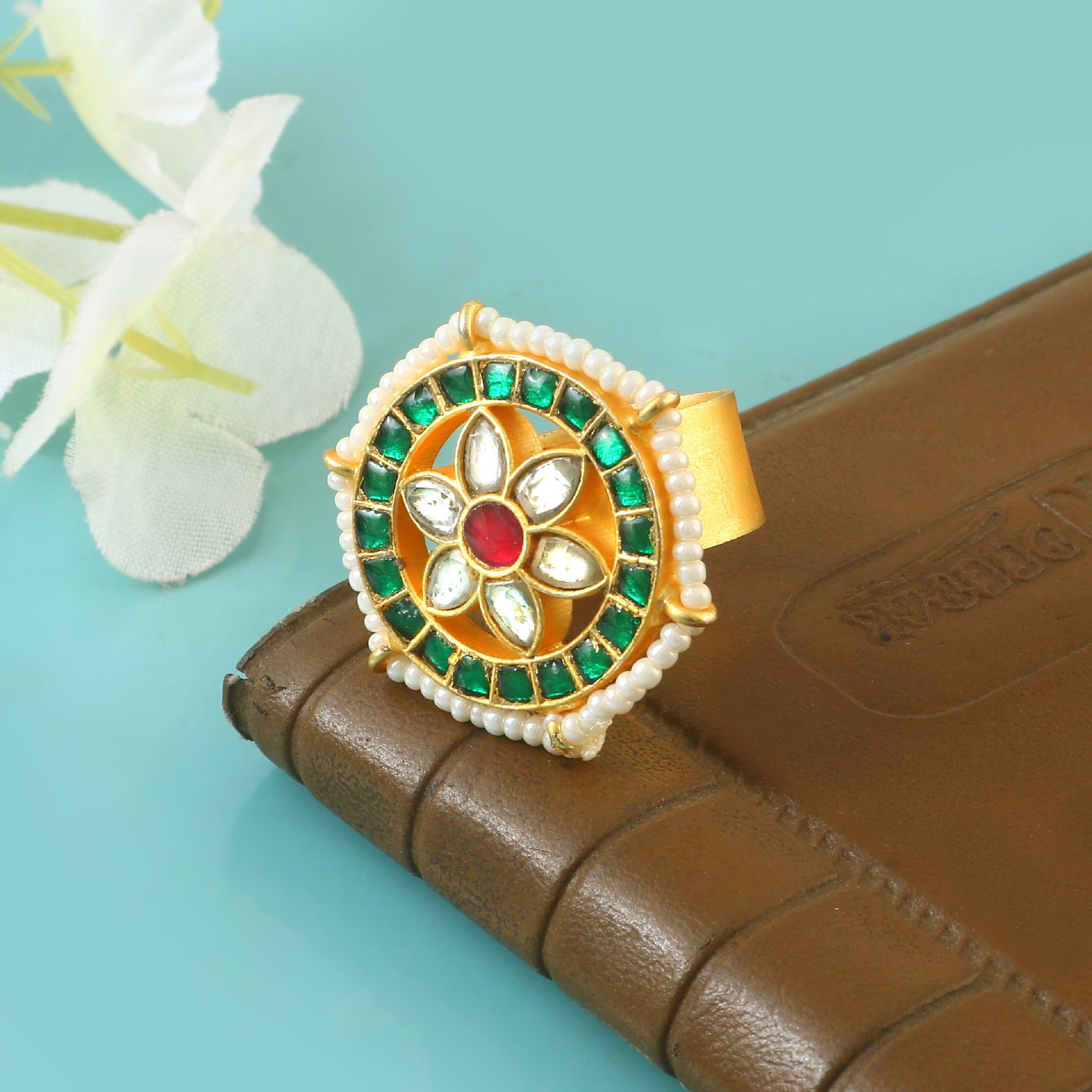 These handcrafted jadau kundan Ring feature a harmonious blend of red, green, and white hues, showcasing intricate artistry and unique design. Each piece reflects meticulous craftsmanship, making them a distinguished accessory that adds elegance and cultural richness to your collection.